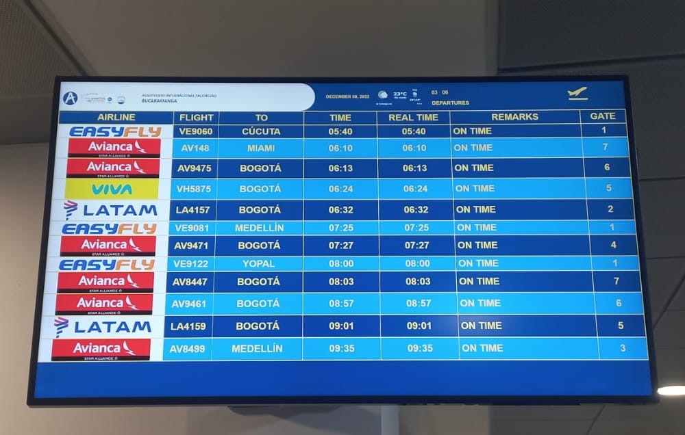 | Bucaramanga | Nacionales: Bogotá, Rionegro (Medellín), Medellín, Pereira, Cali, Cartagena, Santa Marta, Yopal, Cúcuta, Barranquilla, Saravena. | Nacionales: Avianca, LATAM, EasyFly y Satena.