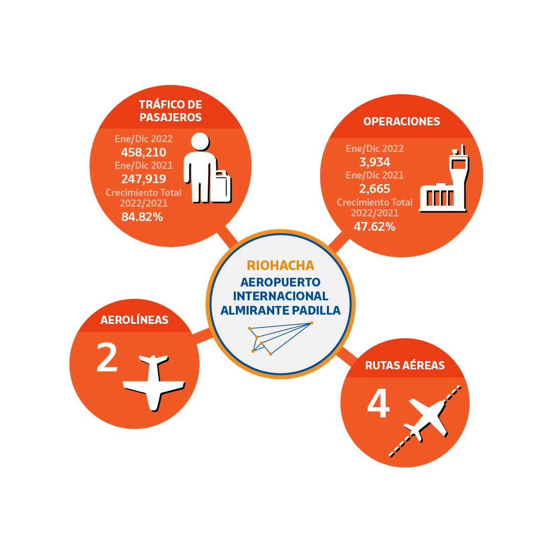“En 2022 registramos un crecimiento cercano al 22 % sobre el total de las operaciones del 2021. Los datos nos muestran un panorama alentador de cara al 2023. Valledupar y Riohacha, son nuestros aeropuertos de mejor dinámica”, explicó el Gerente de Aeropuertos de Oriente S.A.S.