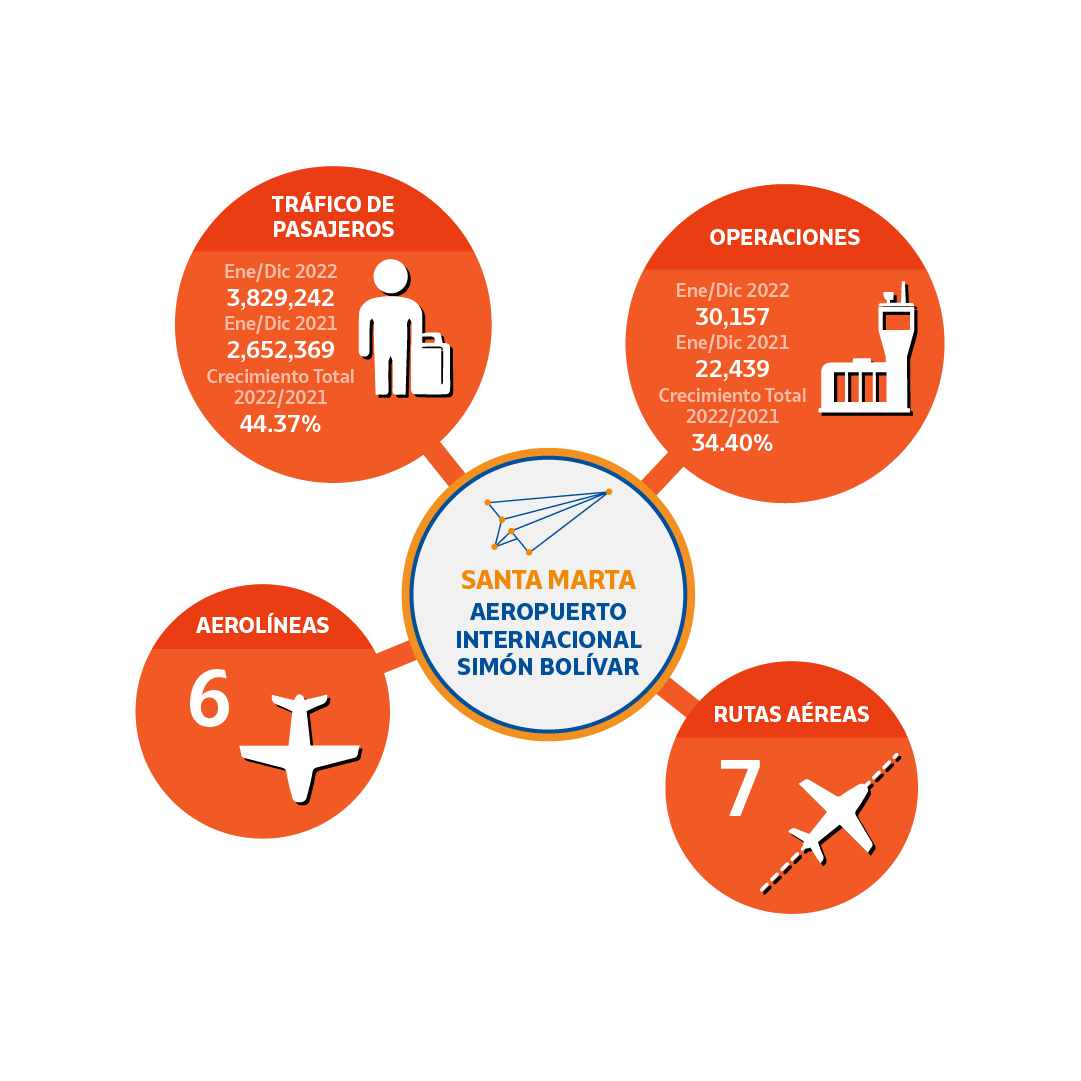 “Al realizar este ejercicio, tenemos que en 2022 el tráfico de pasajeros creció más del 54 % sobre el total de viajeros del 2021 (5.654.709). Los aspectos que en su mayoría promovieron este comportamiento corresponden a la apuesta de diferentes aerolíneas (nuevas y existentes) en abrir y reactivar rutas en destinos nacionales e internacionales hacia Santa Marta, Bucaramanga, Cúcuta, Valledupar y Riohacha”, afirmó Nelson Rodríguez Cruz, Gerente de Aeropuertos de Oriente S.A.S.