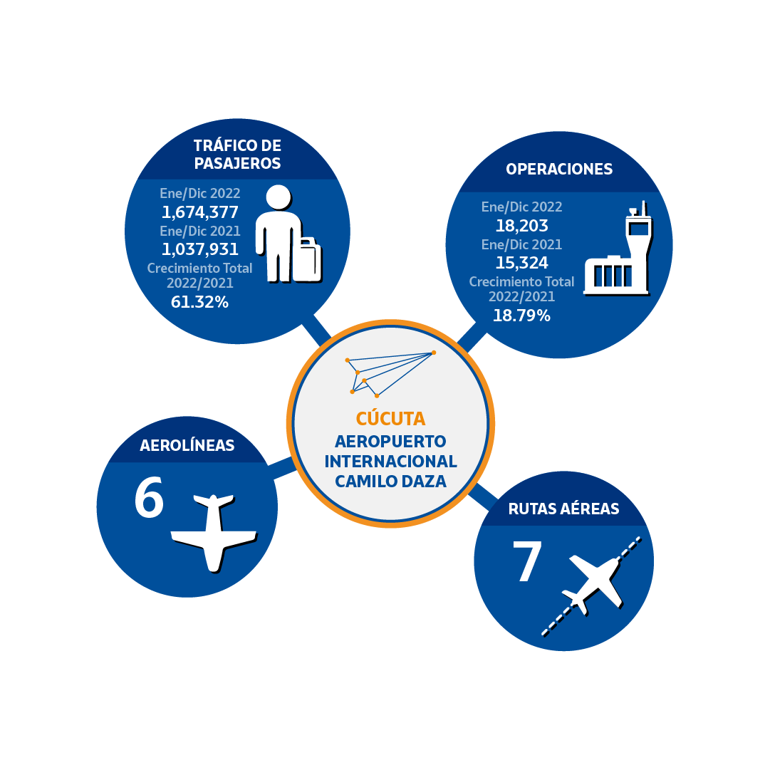 “A pesar de los efectos de la inflación del 2022 y los ajustes en la tarifa del IVA para el sector turismo y aéreo, la Concesión ha logrado mantener las frecuencias en rutas que comenzaron su operación en 2022, caso de los vuelos desde Cúcuta a Cali y Medellín (Avianca); Valledupar – Medellín (Viva Air); Bucaramanga – Cali (Avianca); Santa Marta – Medellín, Pereira y Bogotá (Ultra Air), además de Ciudad de Panamá (Copa Airlines). Igualmente, en 2023, se tendrá el inicio de operaciones de la aerolínea Ultra Air sirviendo los vuelos Riohacha – Medellín y Valledupar – Medellín”, destacó Nelson Rodríguez Cruz.