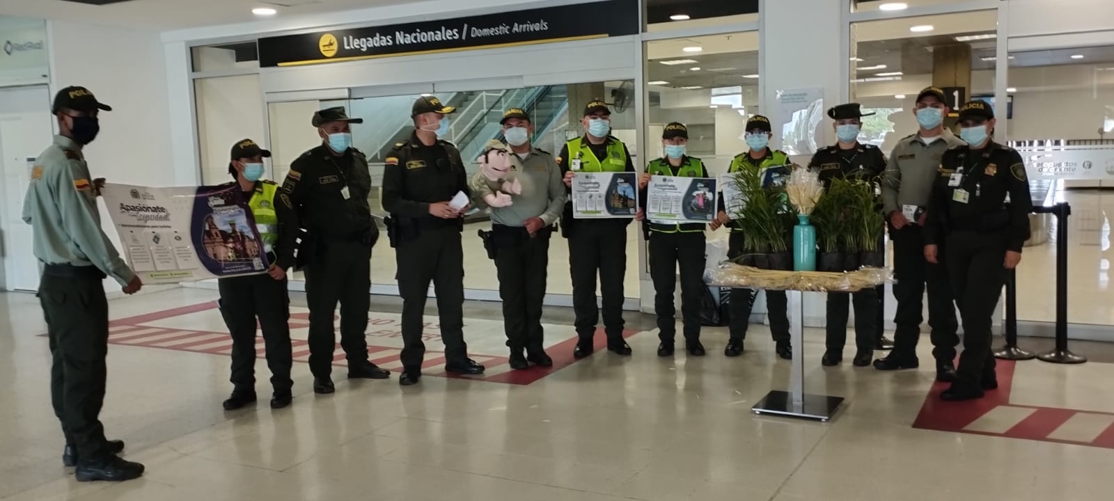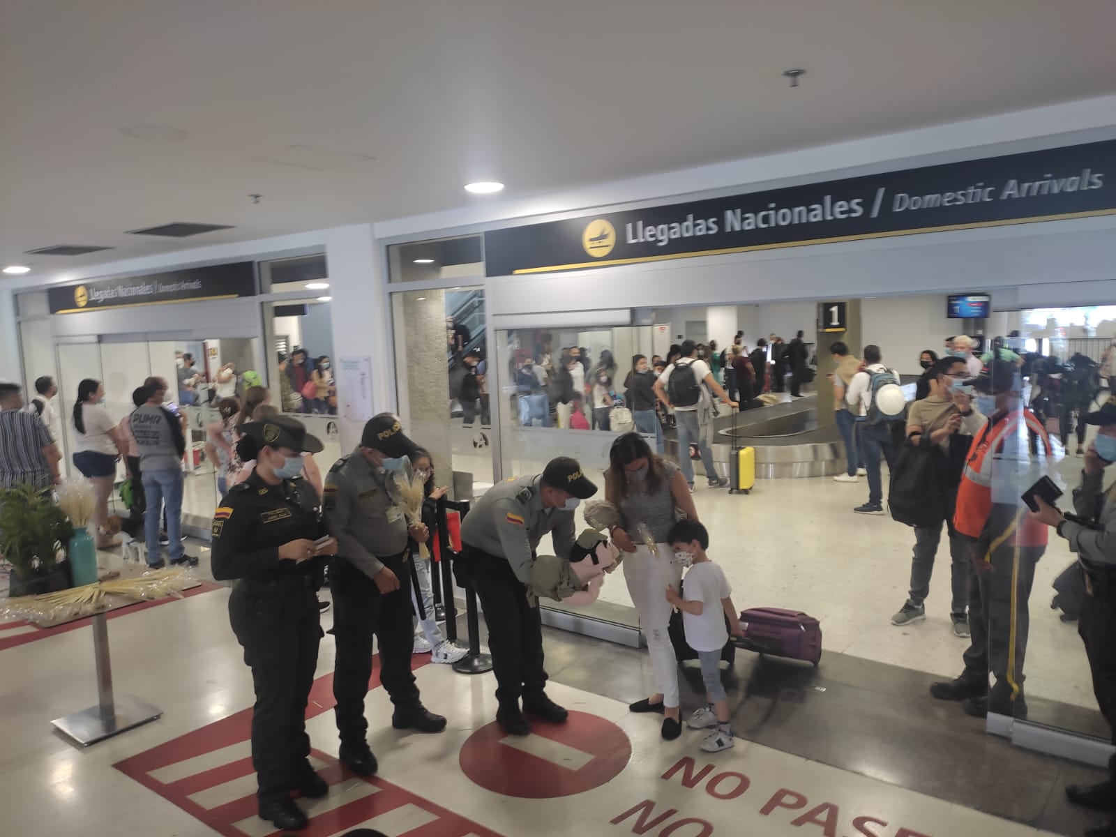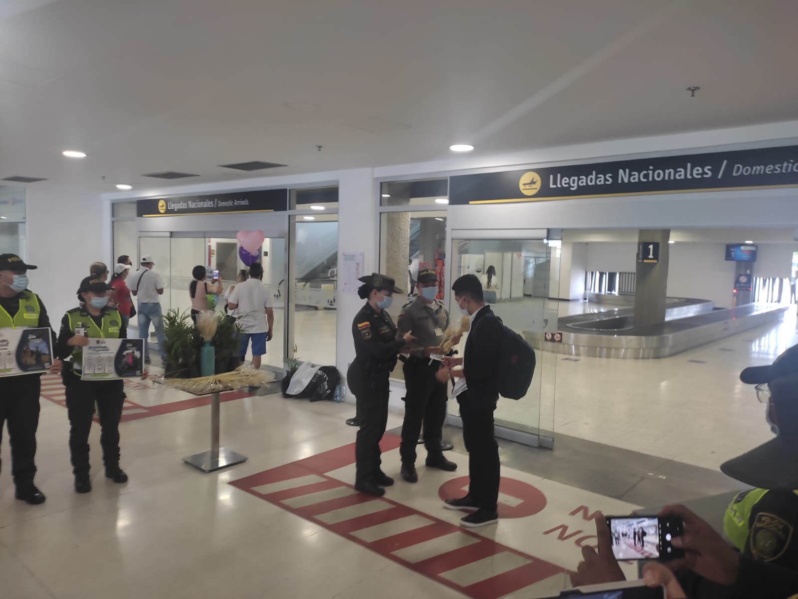 Cúcuta, Norte De Santander. Abril 11 de 2022. La semana santa siempre será un motivo para visitar a nuestros seres queridos, pero también de regocijo, es por ello que la policía aeroportuaria de Cúcuta preparó una bienvenida como símbolo del domingo de ramos a todos los viajeros que iban llegando a la ciudad.